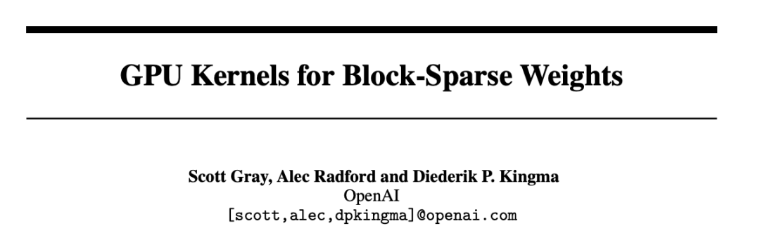 2017 年,Scott作为一作发布了《Block-sparse GPU kernels》,这是OpenAI官方博客上的一篇核心论文,由他与Alec Radford和Durk Kingma合著。