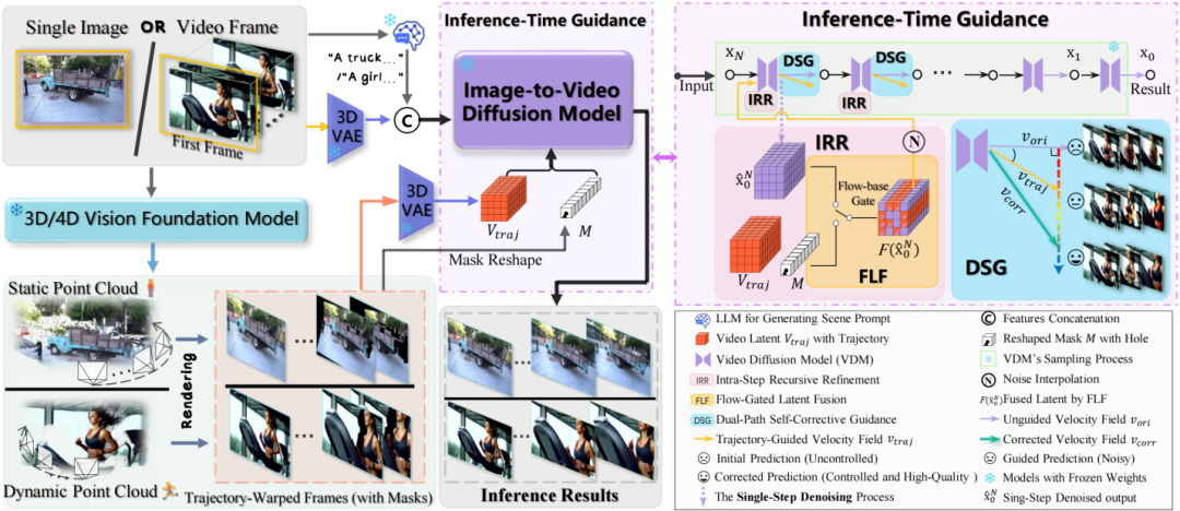 WorldForge的构想十分巧妙:它不试图去改变视频模型本身的权重,而是在其每一步去噪生成的过程中,巧妙地施加时空信息引导与修正。