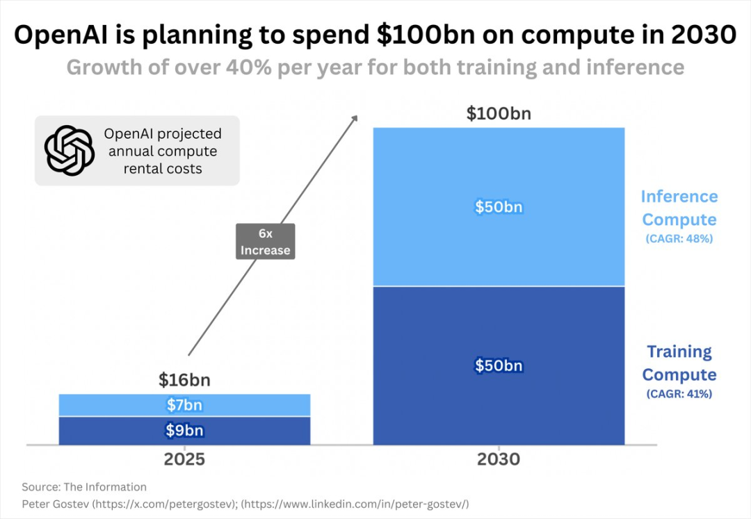 就从今年的数据来看,花的160亿美元中,计算成本为90亿元,推理成本70亿美元,到了2030年,这两项投入都将接近500亿美元。