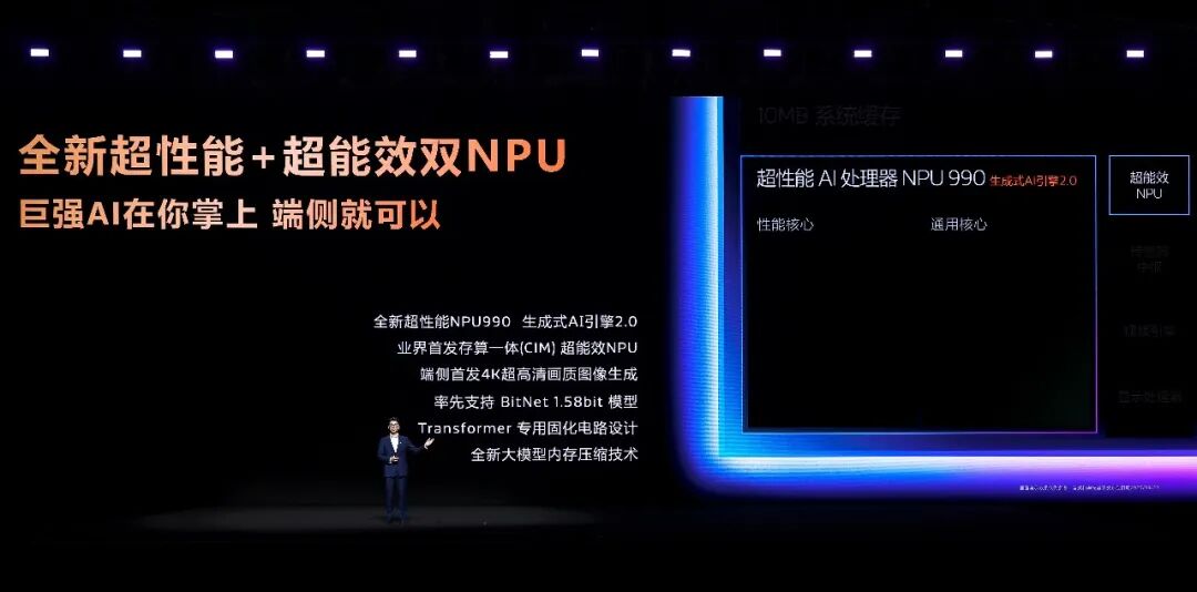 超性能NPU990面向高强度推理任务,搭载全新深层次AI引擎2.0,核心算法调度与执行结构全面重构,支持大模型在本地高效运行。