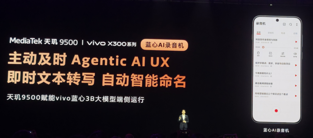 vivo与联发科基于天玑9500联合打造了蓝心AI录音机、分钟级训练的定制美颜,以及全场景的蓝心大模型端侧推理与训练能力;