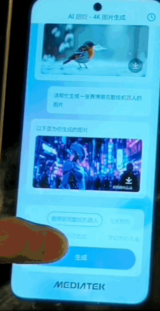 在文生图任务中,天玑9500支持的DiT模型推理性能提升100%,首次实现端侧4K超高画质生图,仅需10秒即可完成生成。