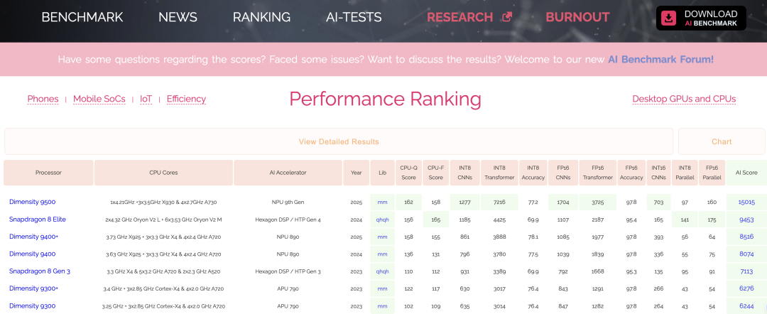 天玑9500围绕这一目标重构芯片底座:首发双NPU架构,结合存算一体、硬件压缩等多项关键技术,在ETHZ苏黎世移动SoC AI榜单中蝉联榜首,相比上一代跑分翻倍。