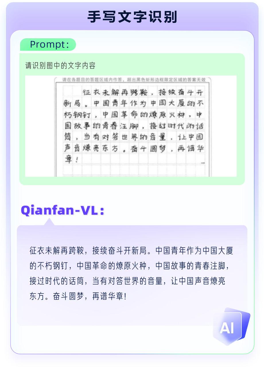 该系列包含3B、8B和70B三个尺寸版本,是面向企业级多模态应用场景,进行了深度优化的视觉理解大模型。Qianfan-VL不仅具备出色的基础通用能力,还针对产业落地中的高频需求,如OCR和教育垂直场景做了专项强化,使其在实际应用中表现更加卓越。