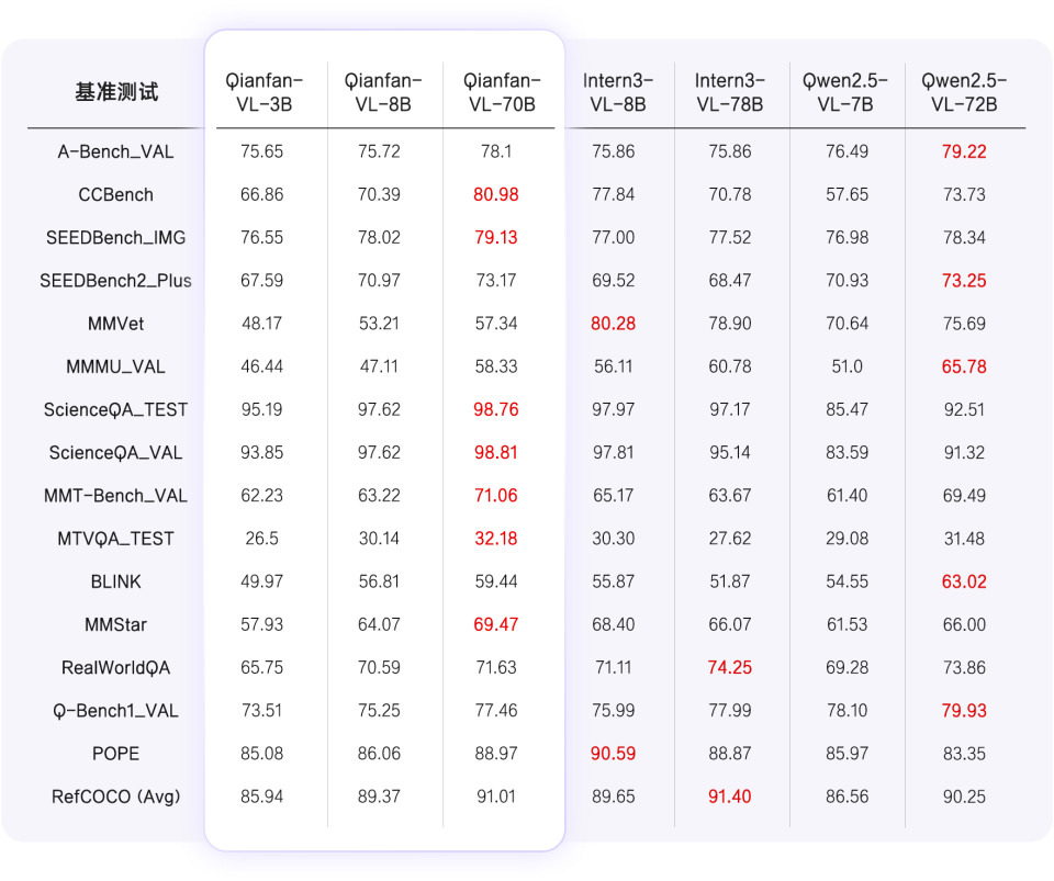 在通用能力基准测试中,Qianfan-VL 系列模型(3B、8B、70B)展现出显著核心优势。