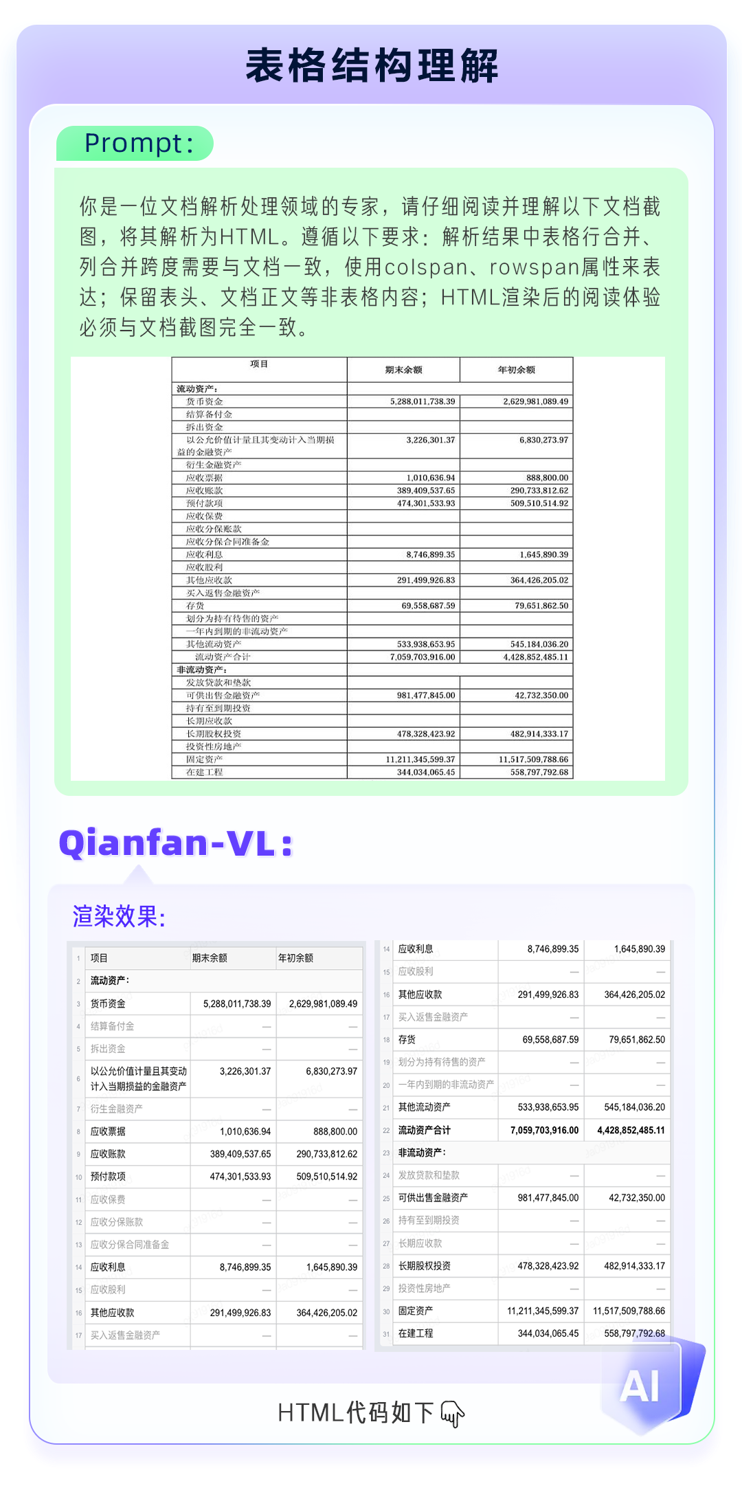 <table border="1"> <thead> <tr> <th>项目</th> <th>期末余额</th> <th>年初余额</th> </tr> </thead> <tbody> <tr> <td colspan="3">流动资产:</td> </tr> <tr> <td>货币资金</td> <td>5,288,011,738.39</td> <td>2,629,981,089.49</td> </tr> <tr> <td>结算备付金</td> <td></td> <td></td> </tr> <tr> <td>拆出资金</td> <td></td> <td></td> </tr> <tr> <td>以公允价值计量且其变动计入当期损益的金融资产</td> <td>3,226,301.37</td> <td>6,830,273.97</td> </tr> <tr> <td>衍生金融资产</td> <td></td> <td></td> </tr> <tr> <td>应收票据</td> <td>1,010,636.94</td> <td>888,800.00</td> </tr> <tr> <td>应收账款</td> <td>389,409,537.65</td> <td>290,733,812.62</td> </tr> <tr> <td>预付款项</td> <td>474,301,533.93</td> <td>509,510,514.92</td> </tr> <tr> <td>应收保费</td> <td></td> <td></td> </tr> <tr> <td>应收分保账款</td> <td></td> <td></td> </tr> <tr> <td>应收分保合同准备金</td> <td></td> <td></td> </tr> <tr> <td>应收利息</td> <td>8,746,899.35</td> <td>1,645,890.39</td> </tr> <tr> <td>应收股利</td> <td></td> <td></td> </tr> <tr> <td>其他应收款</td> <td>291,499,926.83</td> <td>364,426,205.02</td> </tr> <tr> <td>买入返售金融资产</td> <td></td> <td></td> </tr> <tr> <td>存货</td> <td>69,558,687.59</td> <td>79,651,862.50</td> </tr> <tr> <td>划分为持有待售的资产</td> <td></td> <td></td> </tr> <tr> <td>一年内到期的非流动资产</td> <td></td> <td></td> </tr> <tr> <td>其他流动资产</td> <td>533,938,653.95</td> <td>545,184,036.20</td> </tr> <tr> <td>流动资产合计</td> <td>7,059,703,916.00</td> <td>4,428,852,485.11</td> </tr> <tr> <td colspan="3">非流动资产:</td> </tr> <tr> <td>发放贷款和垫款</td> <td></td> <td></td> </tr> <tr> <td>可供出售金融资产</td> <td>981,477,845.00</td> <td>42,732,350.00</td> </tr> <tr> <td>持有至到期投资</td> <td></td> <td></td> </tr> <tr> <td>长期应收款</td> <td></td> <td></td> </tr> <tr> <td>长期股权投资</td> <td>478,328,423.92</td> <td>482,914,333.17</td> </tr> <tr> <td>投资性房地产</td> <td></td> <td></td> </tr> <tr> <td>固定资产</td> <td>11,211,345,599.37</td> <td>11,517,509,788.66</td> </tr> <tr> <td>在建工程</td> <td>344,034,065.45</td> <td>558,797,792.68</td> </tr> </tbody></table>除上述场景应用案例外,Qianfan-VL同样可应用在图表分析、视频理解等场景中,均呈现出卓越的模型效果。