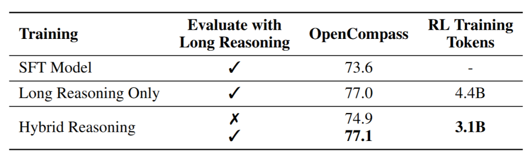进入强化学习阶段,两种模式被同时优化,不仅显著增强了深度思考模式的性能,更实现了两种模式间推理能力的交叉泛化。模型在节省约30%采样开销的前提下,仍能达到和仅深思考强化学习的模型相当的表现。