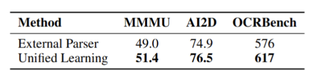 团队在轻量训练设置下对该学习范式进行了消融验证,结果说明面向文档的统一OCR和知识学习范式有效提升了模型在文档理解、知识推理、文字识别上的能力:
