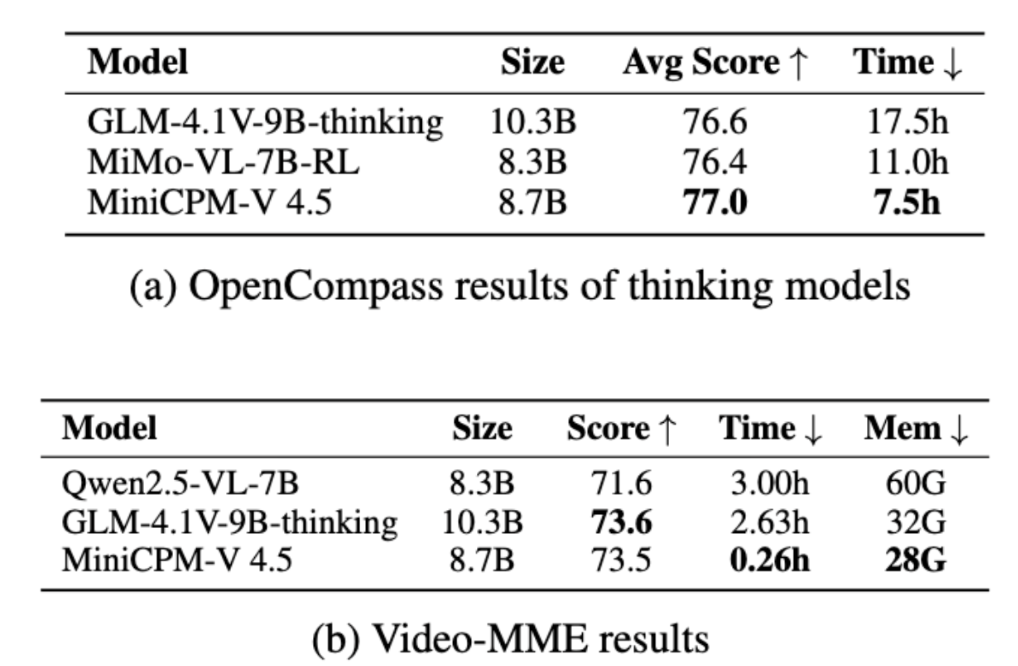在混合思考模式下,MiniCPM-V 4.5在推理耗时仅为同规格深度思考模型的42.9%-68.2%的同时获得了更好的OpenCompass分数。