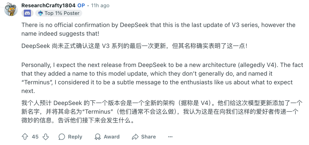 有人已经开始畅想:下一个版本会是全新的架构(V4)。毕竟DeepSeek的命名还是比较规律的,不像硅谷某厂……