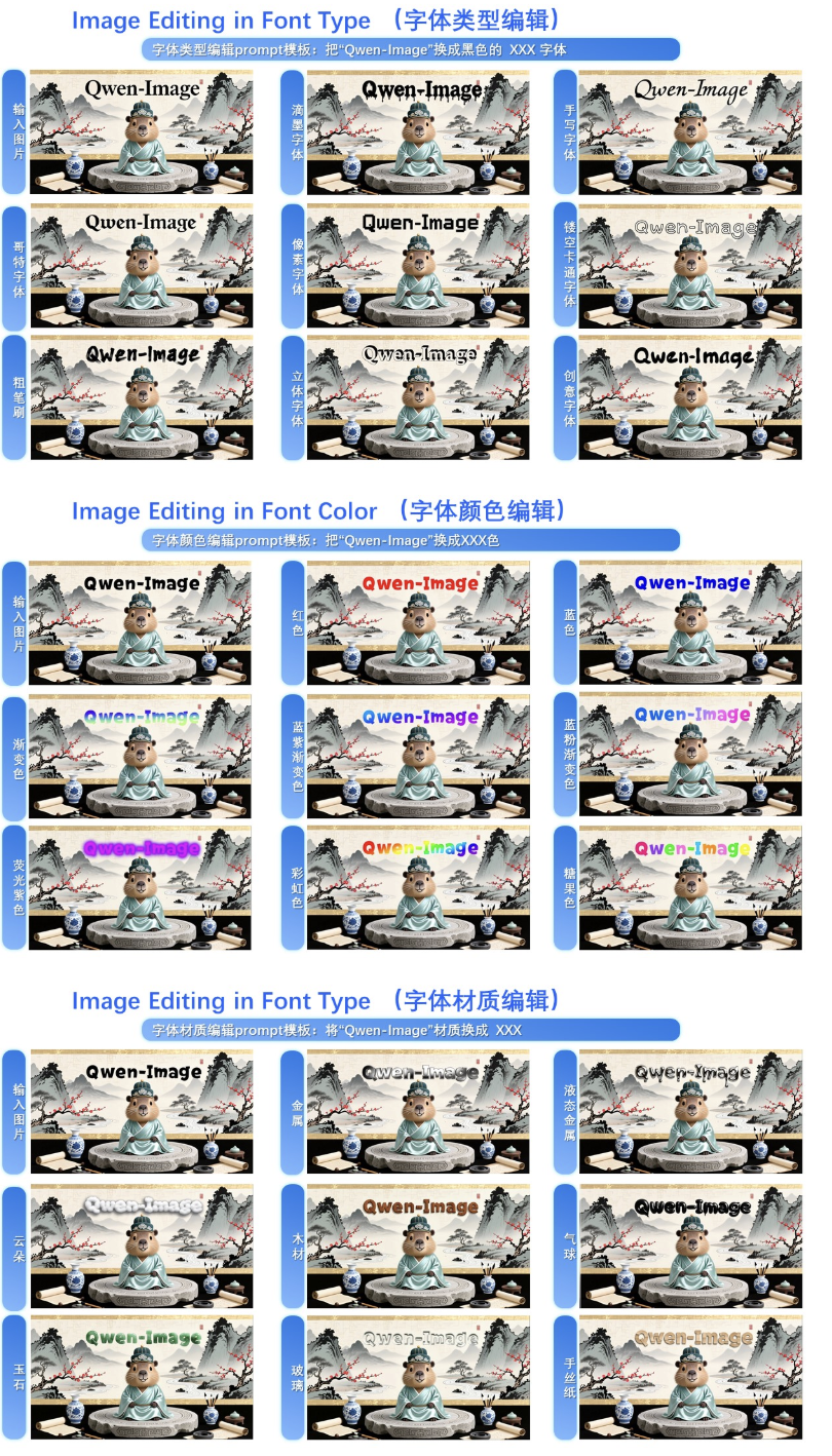 除了图像方面,新模型还专门增强了文字一致性,支持了包括字体类型编辑、字体颜色编辑和字体材质编辑。