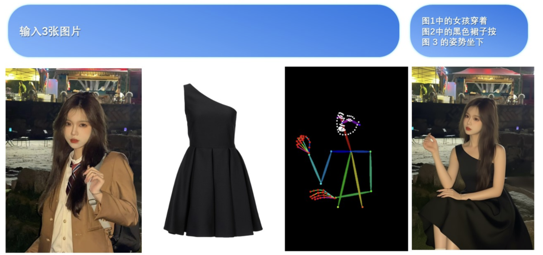 此外,多图输入也支持ControlNet常用的关键点图,比如改变人物姿势。