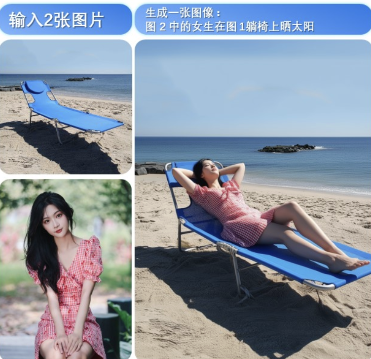 不仅支持多图融合,提供“人物+人物”,“人物+商品”,“人物+场景” 等多种玩法,还增强了人物、商品、文字等单图一致性。