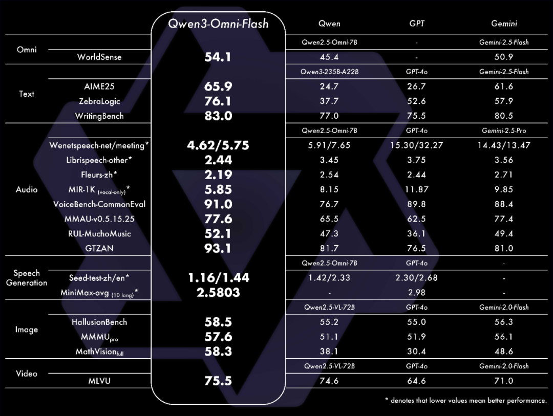 跨模态的领先性能:在36项音频及音视频基准测试中,Qwen3-omni斩获32项开源SOTA与22项总体SOTA,超越Gemini-2.5-Pro、Seed-ASR、GPT-4o-Transcribe等闭源强模型,同时其图像和文本性能也在同尺寸模型中达到SOTA水平。
