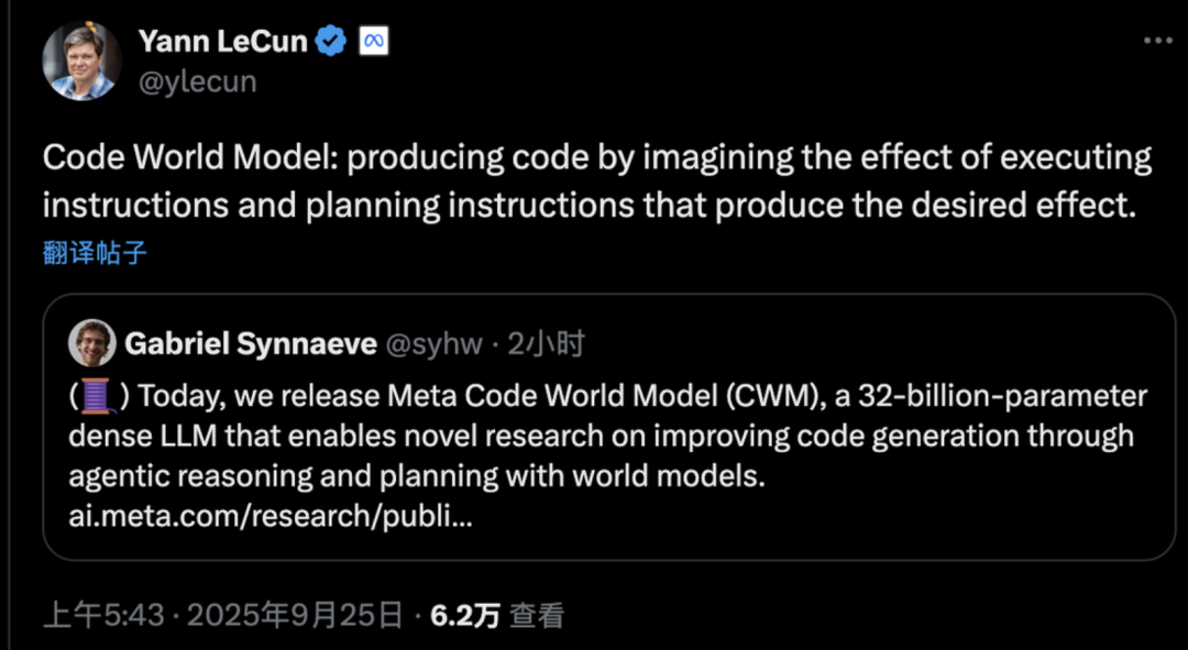 FAIR团队称CWM验证了“代码世界建模”对提升推理与代码生成的价值。