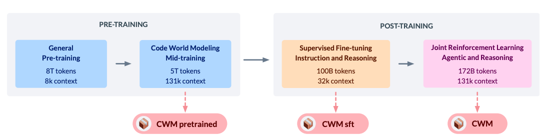 在这个阶段,CWM使用了8T tokens的数据进行通用语言与代码建模训练。
