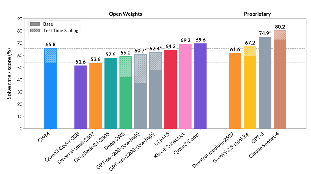 在多个代码与推理任务上,CWM均有出色表现,譬如其在SWE-bench Verified得分65.8%,领先所有开源同规模模型,已接近GPT-4级别。