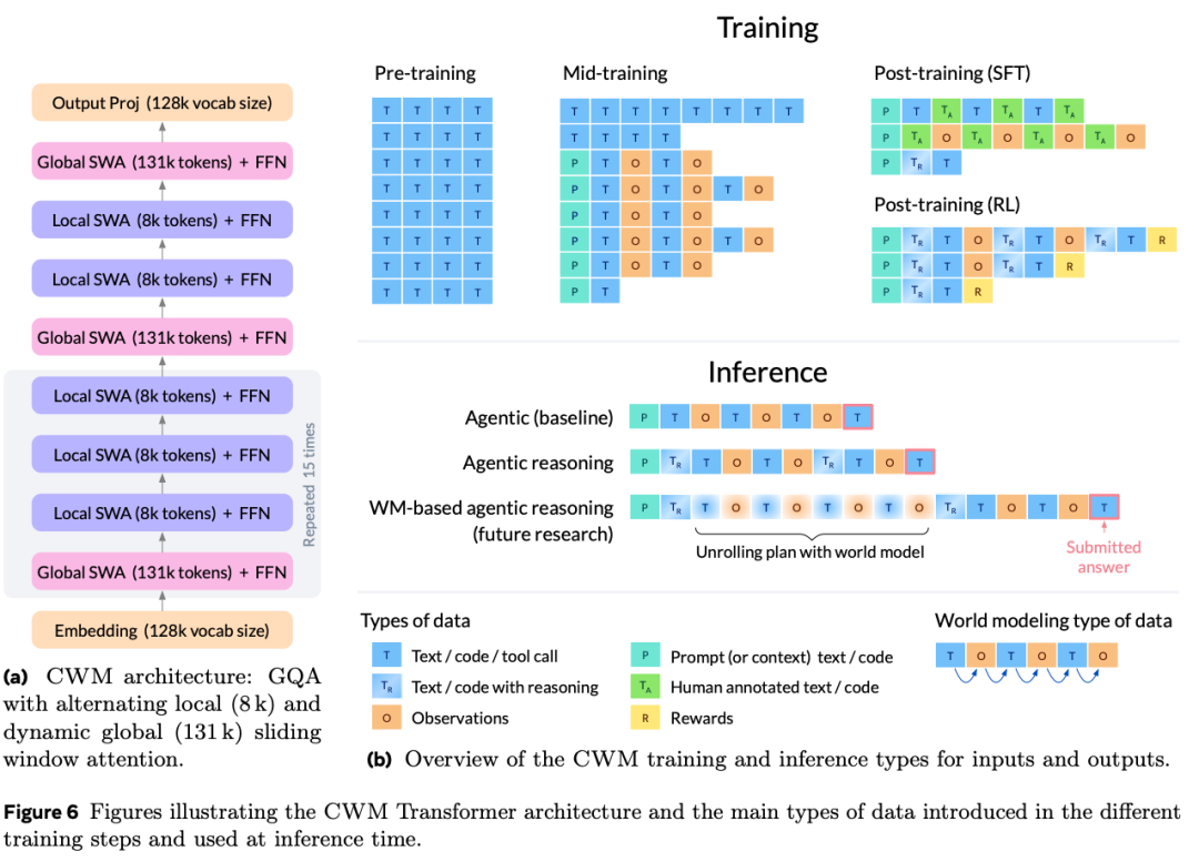 CWM(Code World Model),一个参数量为32B、上下文大小达131k token的密集语言模型,专为代码生成和推理打造的研究模型