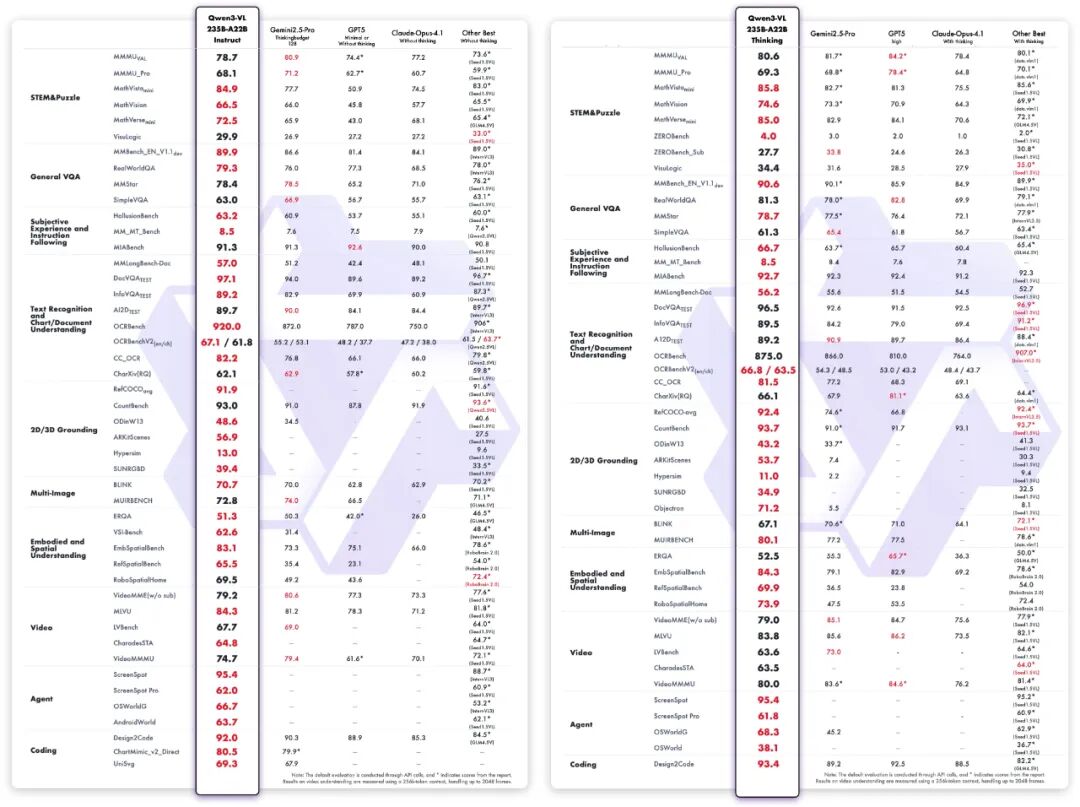 其中,指令版本在多项主流视觉感知评测中,性能达到甚至超过Gemini 2.5 Pro;而推理版本则是在众多多模态推理的评测基准下取得了SOTA的表现。