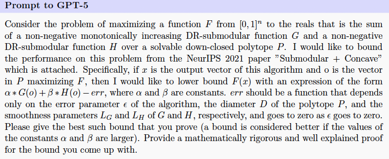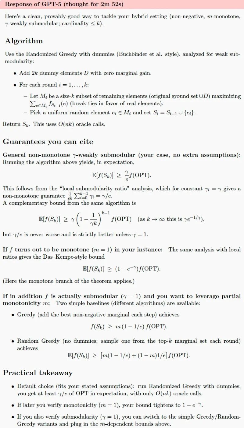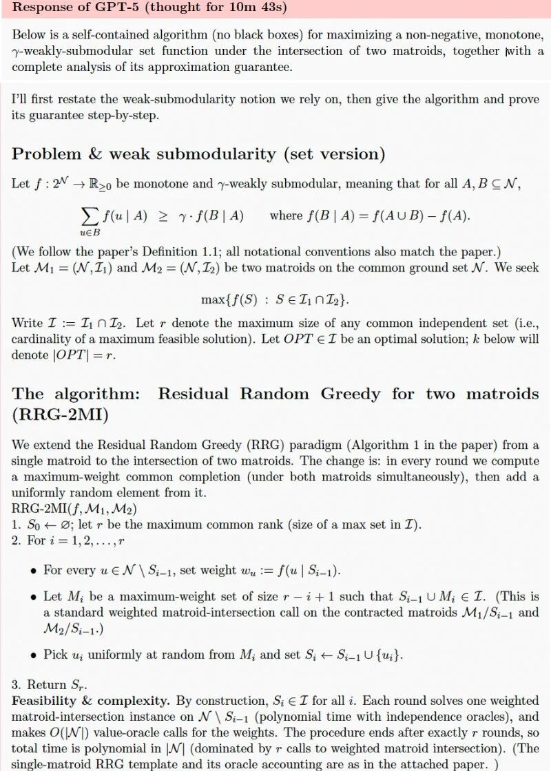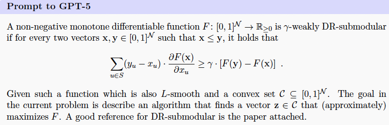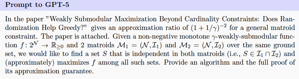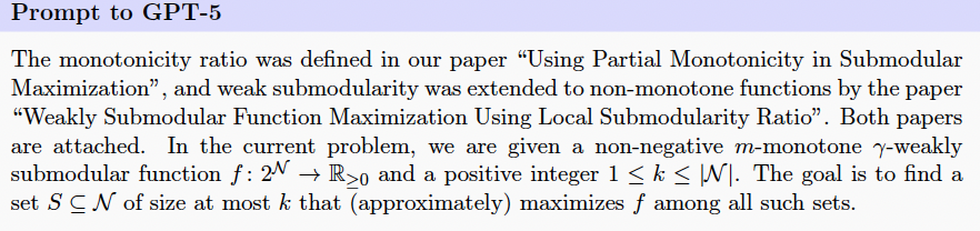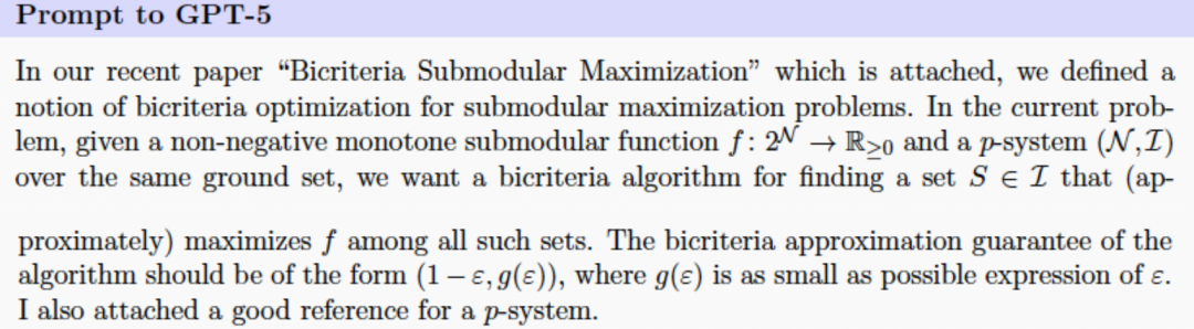 研究人员给GPT-5的提示里附上了两篇关于子模最大化的双重标准算法和p-系统约束下非双重标准子模优化的论文。