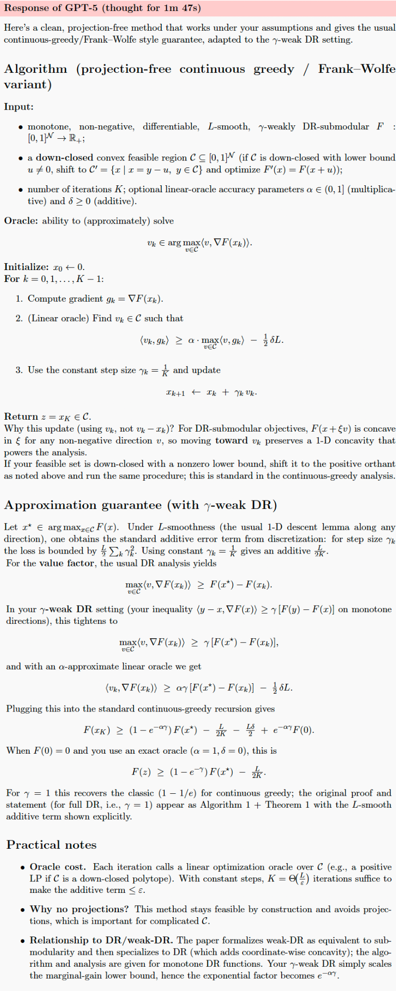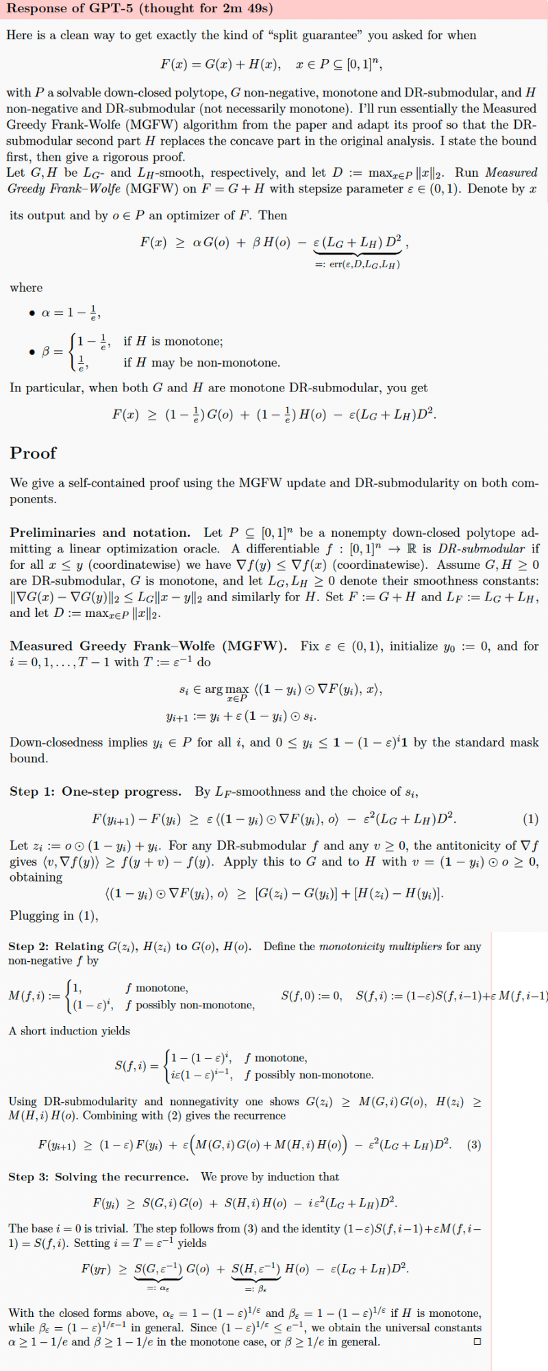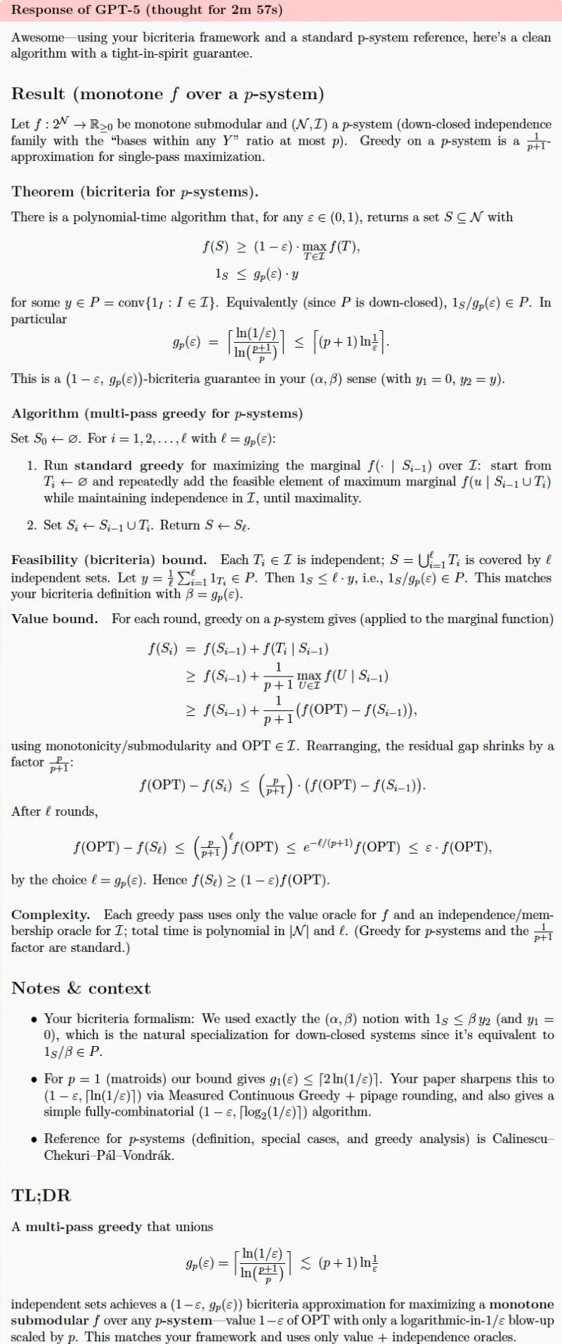 研究人员给GPT-5的提示里附上了两篇关于子模最大化的双重标准算法和p-系统约束下非双重标准子模优化的论文。