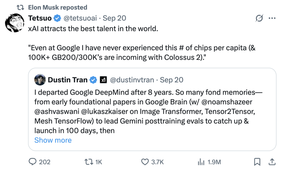 在算力方面,即便在Google我也从未体验过如此奢侈的人均芯片数量,更别说Colossus 2还有数十万张GB200芯片尚未到货。
