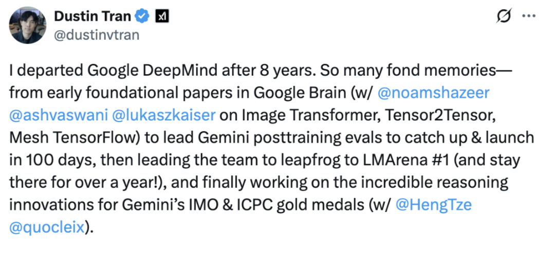 大佬叫Dustin Tran,他是Gemini DeepThink的共同创造者,该模型一经发布便展现出SOTA级别的推理能力,在过去两个月内连斩IMO和ICPC金牌。