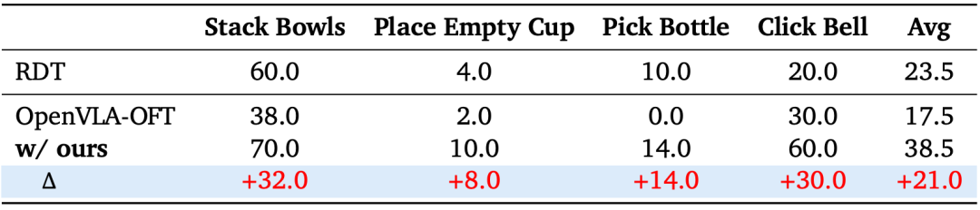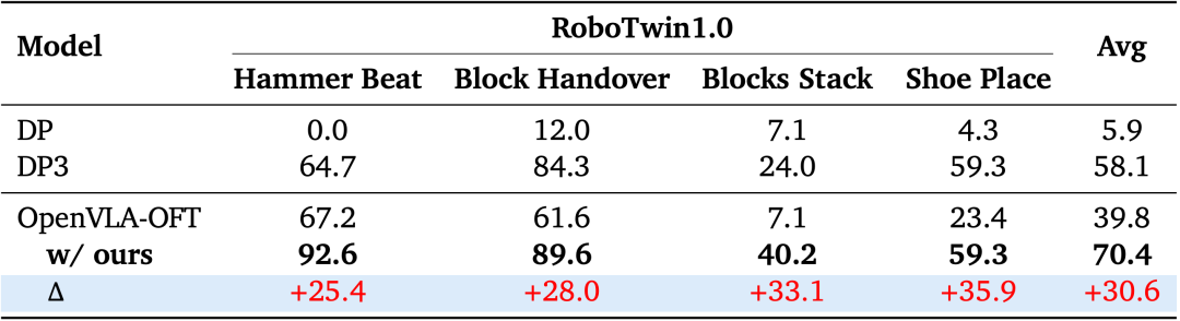 四个任务平均成功率从39.8%提升至70.4%,其中 “Blocks Stack” 任务提升33.1个百分点(7.1%→40.2%)。