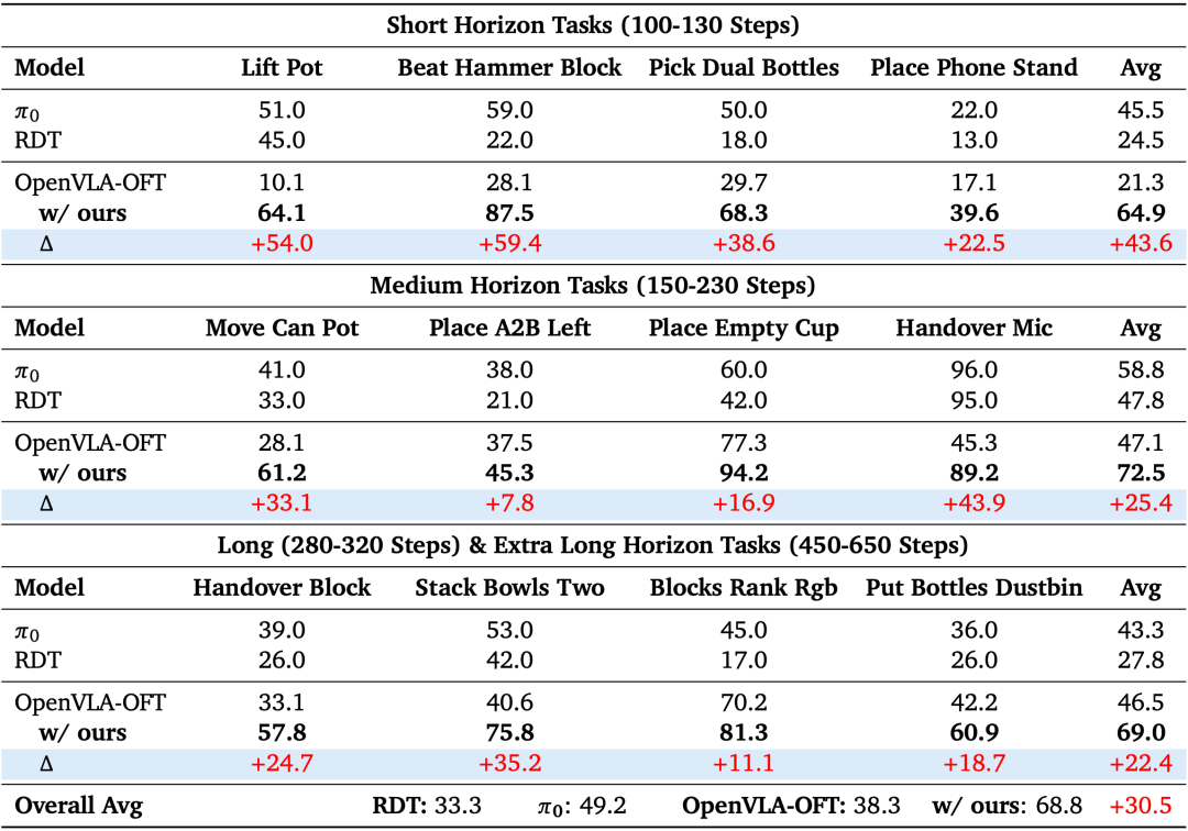 覆盖短/中/长/超长时序12个任务,平均成功率从38.3%提升至68.8%,超越π₀(49.2%)和RDT(33.3%)。即使是需多轮交互的超长时序任务(如 “Put Bottles Dustbin”),也提升18.7个百分点。