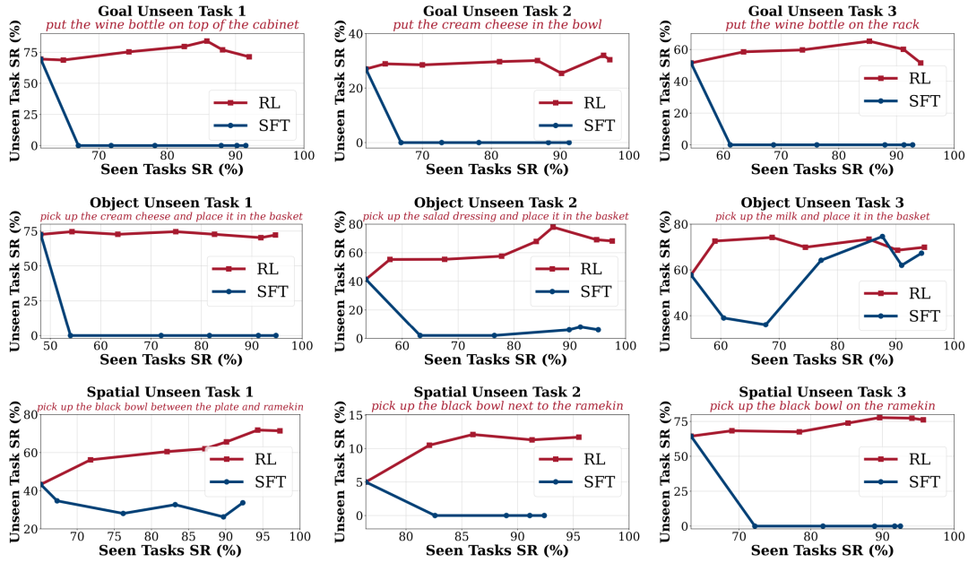 SFT的学习过程高度依赖于任务与场景特定的数据分布,因而在面对分布外任务(out-of-distribution tasks)、全新环境或未见过的对象时,模型性能会显著下降,尤其在长时序依赖与组合型任务中尤为明显。