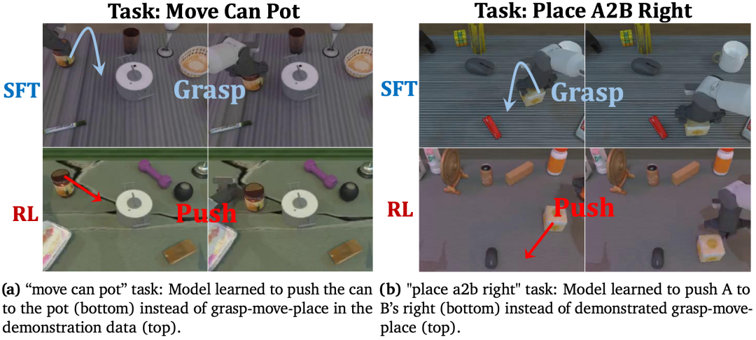 在RoboTwin 2.0的 “Move Can Pot” 与 “Place A2B Right” 两个任务中,SFT模型仅能复现演示数据中显式呈现的“抓取–移动–放置”操作序列。