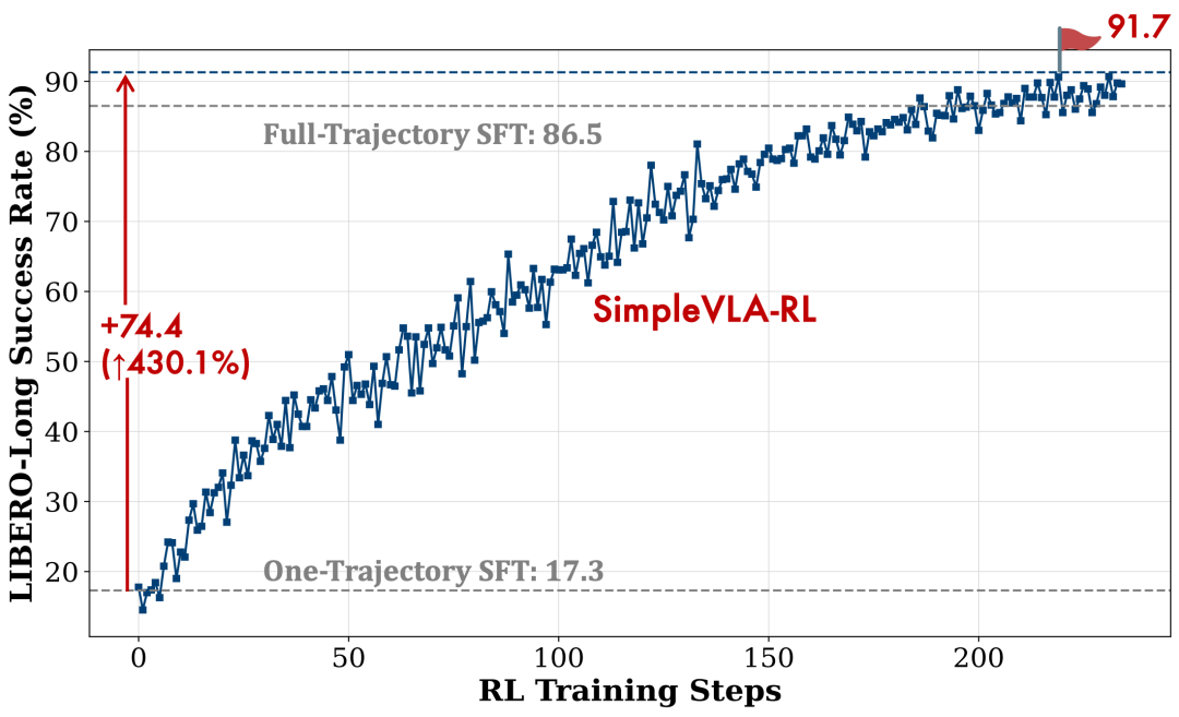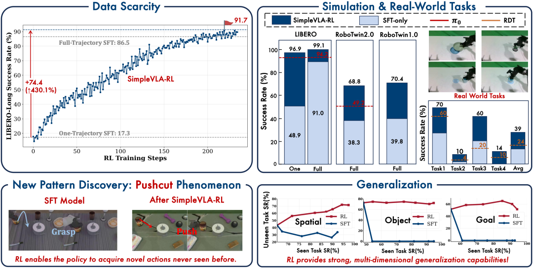 在 “单轨迹 SFT”(每个任务仅1条演示数据)场景下,应用SimpleVLA-RL后,OpenVLA-OFT的LIBERO平均成功率从48.9%提升至96.9%,长时序任务LIBERO-Long从17.3%提升至91.7%。