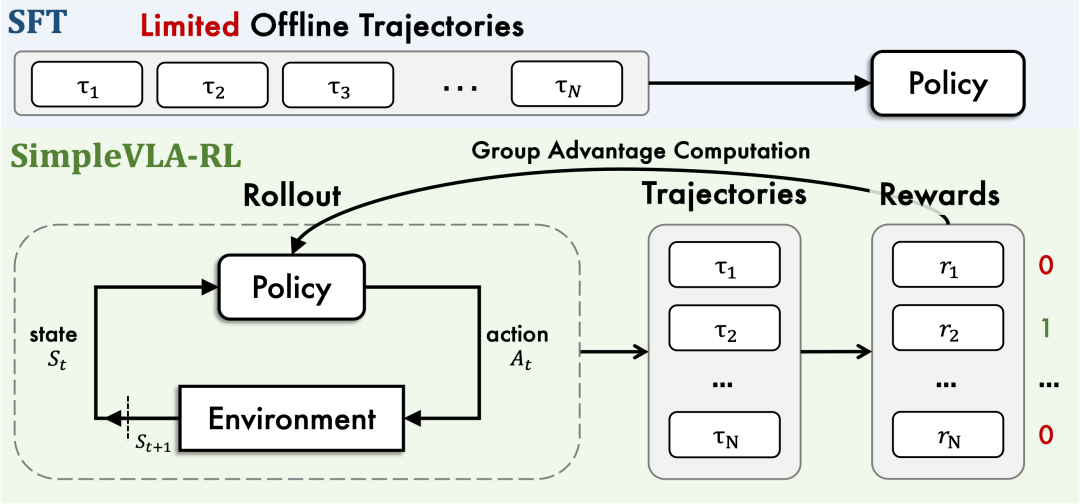基于上述问题,研究团队出了SimpleVLA-RL,它是在veRL(LLM强化学习框架)上扩展的一套端到端在线训练方案,专门针对VLA模型的特点做了优化。