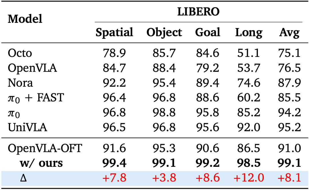 在Spatial、Object、Goal、Long四个任务集上,SimpleVLA-RL将OpenVLA-OFT 的平均成功率从91.0%提升至99.1%,其中长时序任务LIBERO-Long提升12.0个百分点(86.5%→98.5%),超越π₀(85.2%)、UniVLA(92.0%)等SOTA模型。