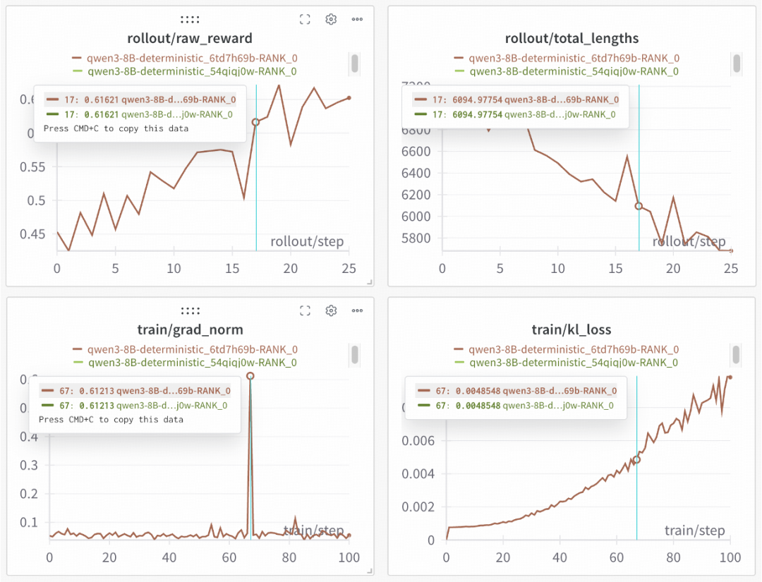 在此基础上,SGLang团队联合slime团队一起,以极少代码实现了完全可复现的稳定RL训练,具体细节现在全面公开。