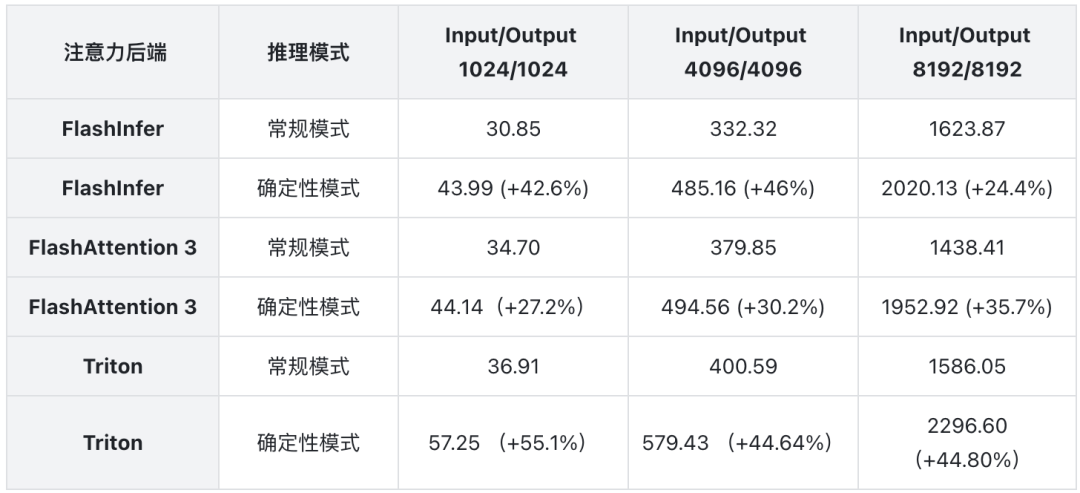 测试结果显示,确定性推理具有良好的可用性,大部分性能下降控制在25%到45%之间,其中FlashInfer和FlashAttention 3后端的平均性能下降为34.35%。大部分开销来自未经优化的基于Triton编写的批次不变算子,这表明性能仍有很大的提升空间。