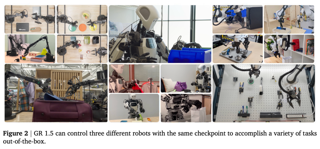 这样一来,看似完全不同的硬件——比如机械臂与人形机器人——在模型眼中就有了共通语言,于是能把不同机器人平台的动作映射到一个统一的表示空间,使得GR 1.5系列具备操作经验跨机器人迁移的能力。