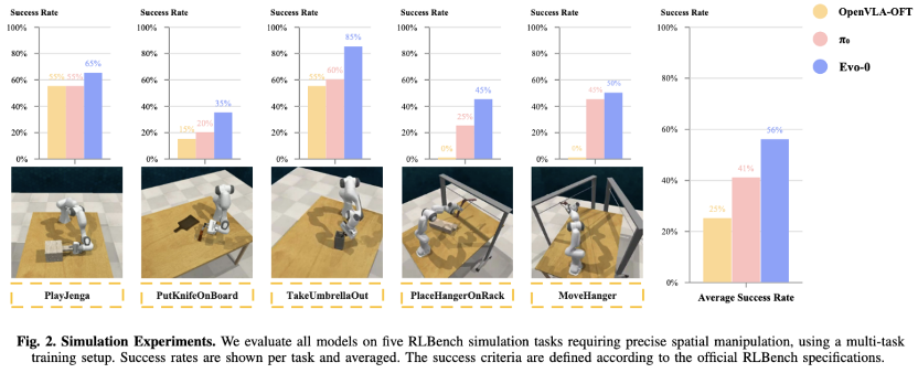 在rlbench仿真实验中,Evo-0在5个需要精细操作的任务上,平均成功率超过基线pi0 15%,超过openvla-oft 31%。