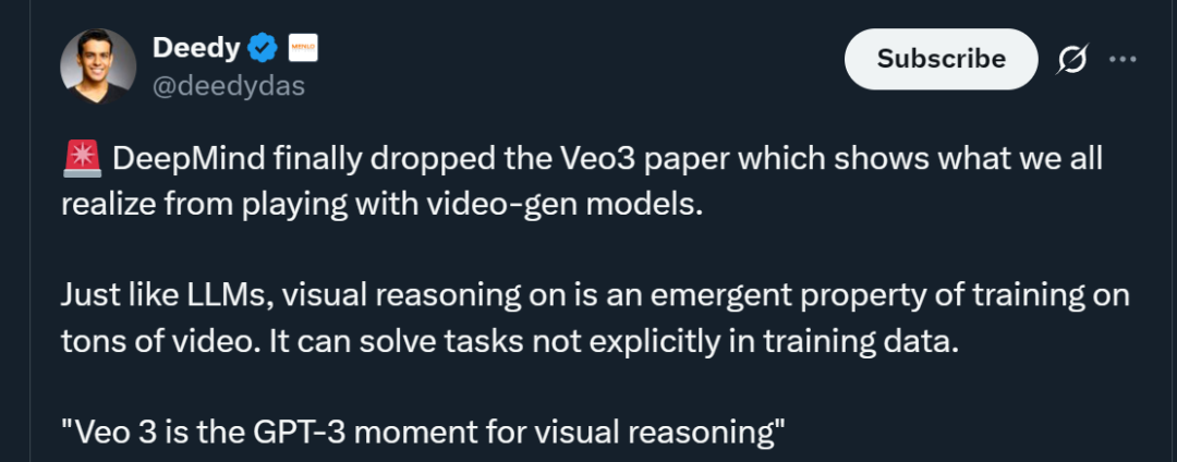 更简单粗暴的总结就是,“Veo 3是视觉推理领域的GPT-3时刻”。