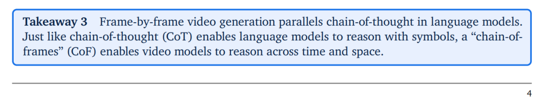 逐帧视频生成类似于语言模型中的链式思维。就像链式思维(CoT)使语言模型能够用符号进行推理一样,“帧链”(CoF)使视频模型能够在时间和空间上进行推理。