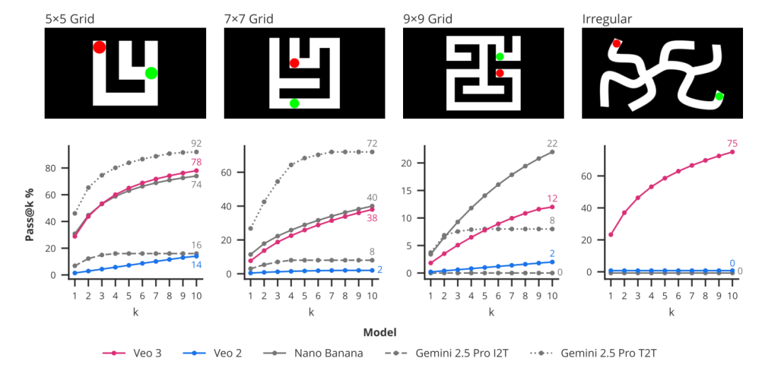 Veo 3能生成红点一步步规划路径的视频,不碰黑墙。5×5迷宫玩了10次,Veo 3成功率78%,Veo 2才14%。