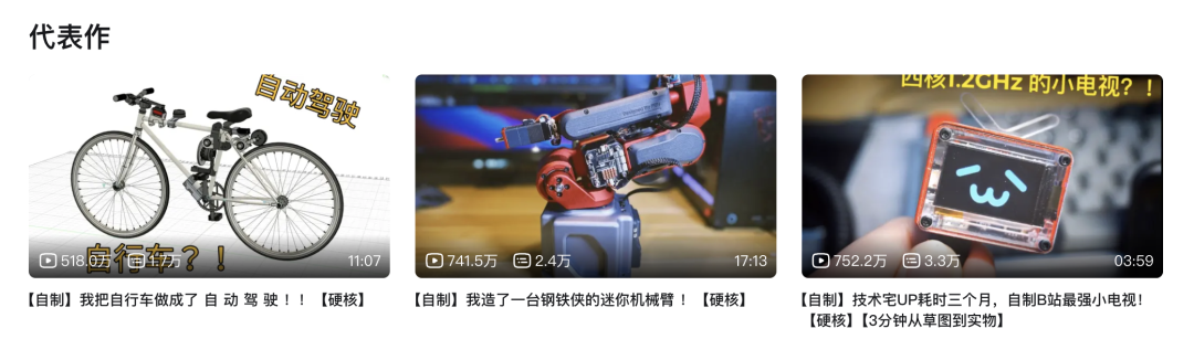 他的B站账号「稚晖君」曾发布了多条自制机器人的演示视频——能给葡萄缝针迷你机械臂,装配了自动驾驶的自行车,硬币大小的迷你Linux电脑——播放量均在百万以上。