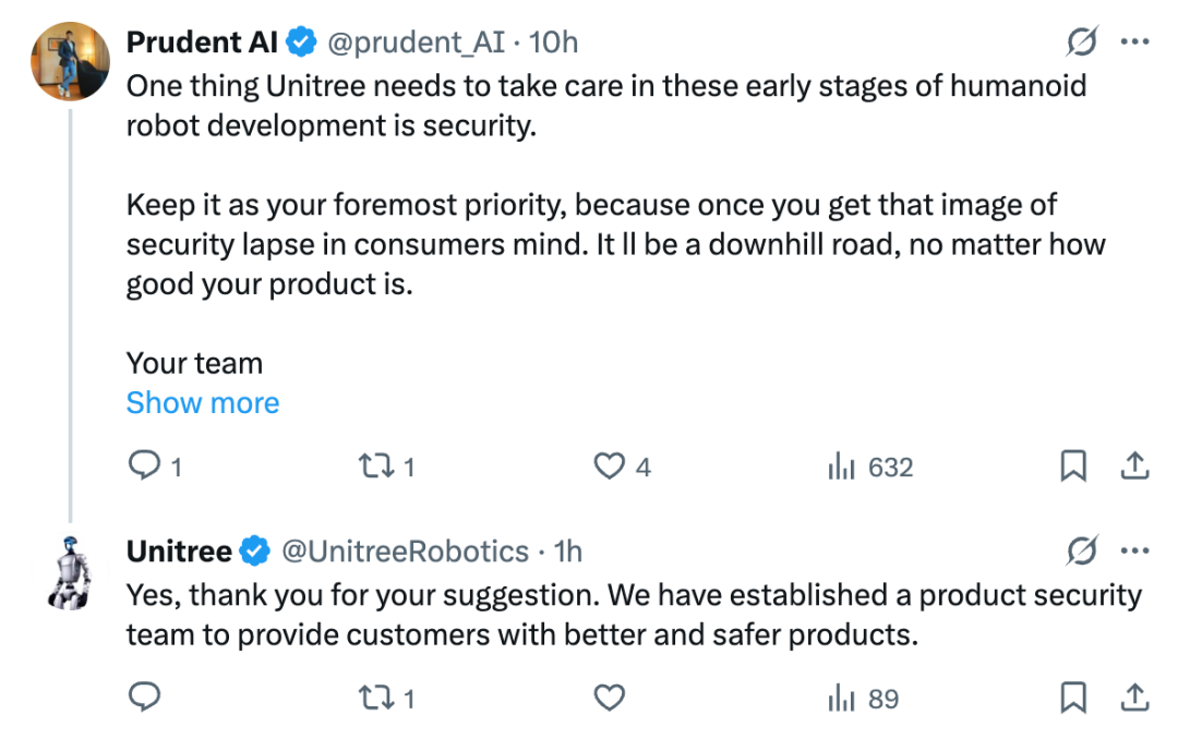 宇树很快回复了该网友,称其提醒得对,且公司“已成立产品安全团队,为客户提供更优质、更安全的产品”。