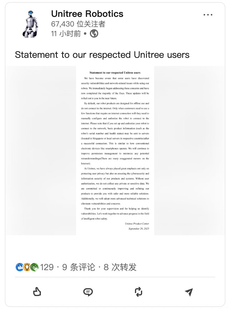 同时,宇树也在回应声明最后感谢了外界监督,并希望携手共同推动智能机器人安全领域的进步。