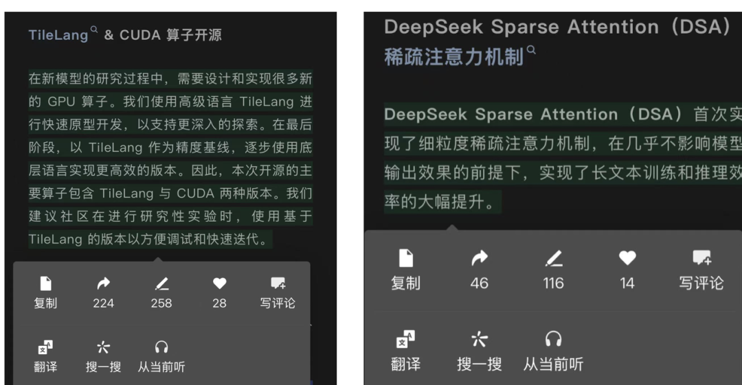 v3.2论文中提到在内核层面共享k-v提升计算效率,让DSA的闪电索引器机制(lightning indexer)运行速度远超传统实现。