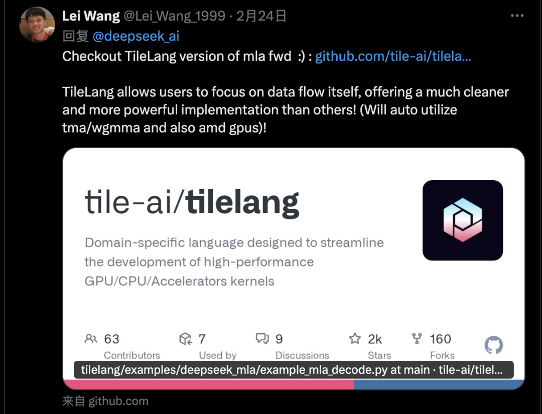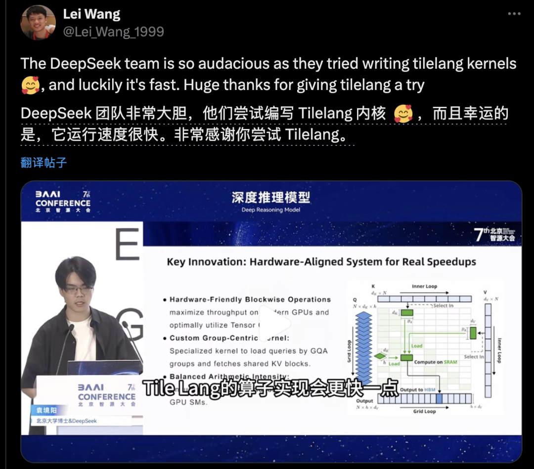 TileLang的发起人之一,北大博士研究生王磊当时还专门发帖感谢DeepSeek尝试他们的语言。