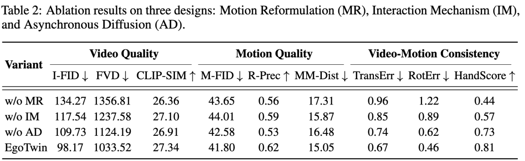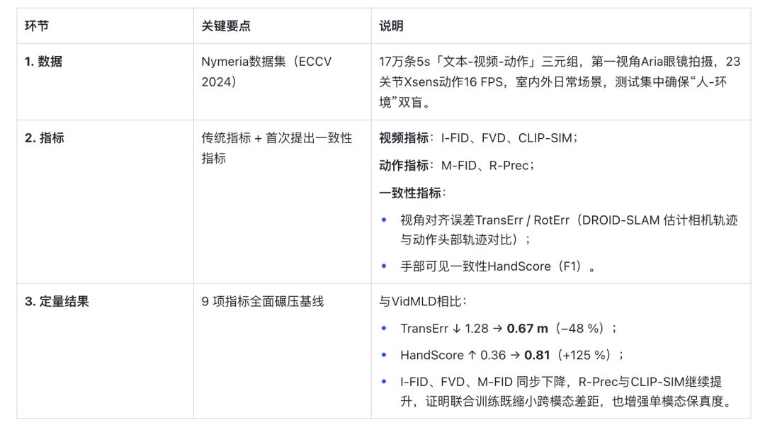 实验证明,EgoTwin比之前的基础模型好很多:视频和动作的匹配度更高,比如镜头和头部的位置误差变小了,手的动作在视频里也更容易对应上;