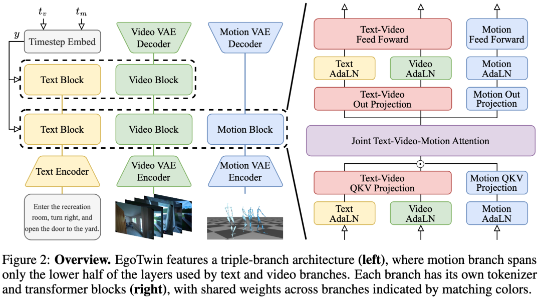 为解决上述挑战,EgoTwin基于扩散Transformer架构,构建了“文本-视频-动作”三模态的联合生成框架,通过三大关键设计实现突破两大难题。