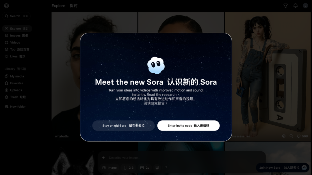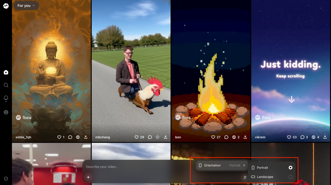 进入界面,首先就能看到一些网友整活的案例,下方就是此次Sora 2的输入框,支持上传图像,右侧设置可选择横屏、竖屏。