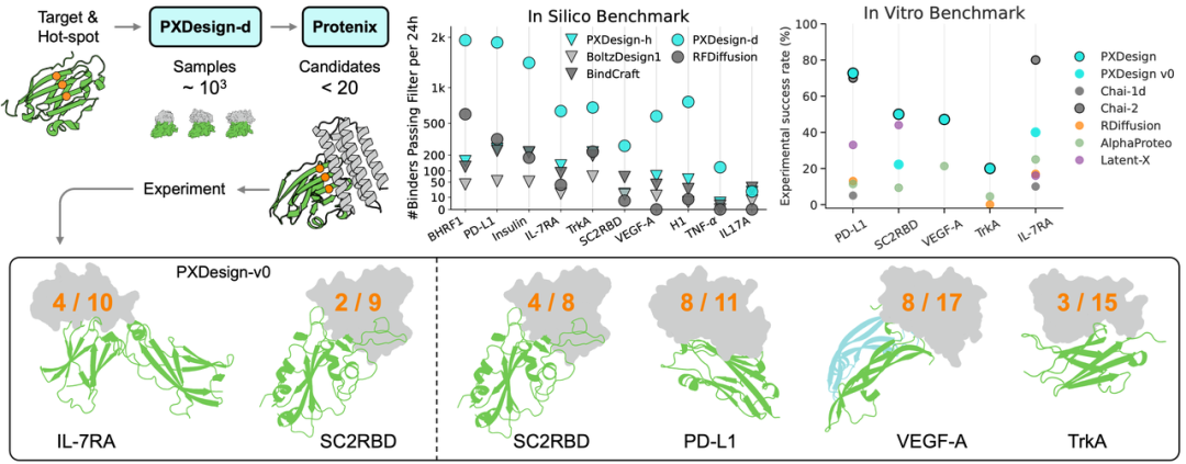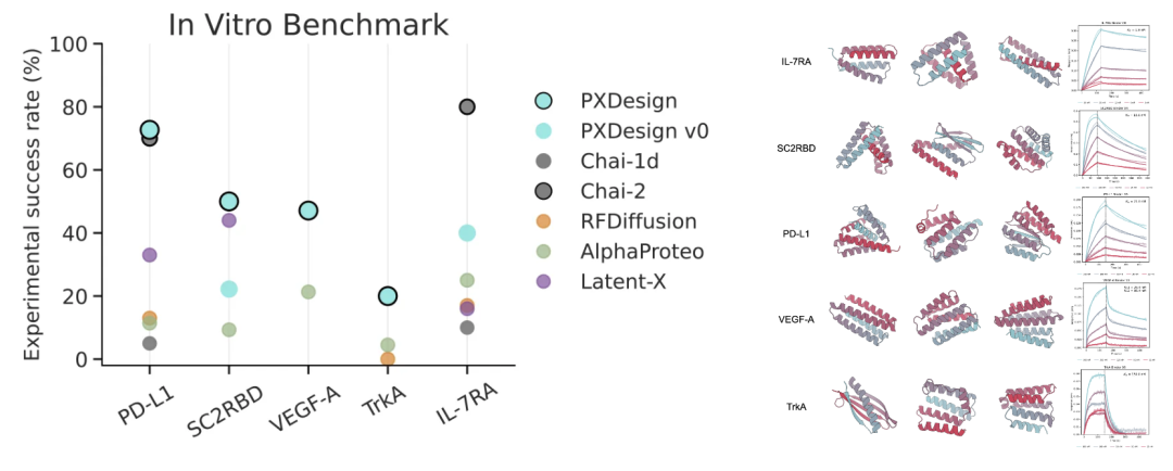 实验室验证表明,PXDesign在多个靶点上取得了20–73%的实验成功率,在相同靶点相较DeepMind的AlphaProteo提升2–6 倍,达到了当前领域最高水准。